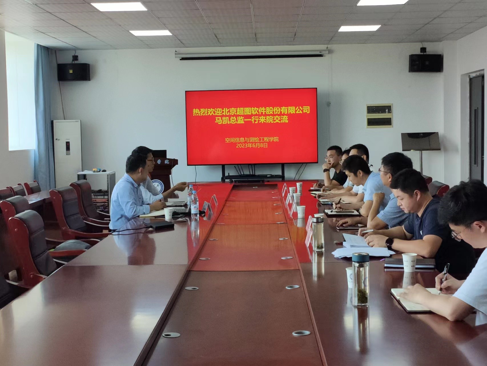 6月8日下午14:30,应永利集团3044官网欢迎您邀请,北京超图软件股份有限公司华东平台客户中心行业总监马凯一行来院交流,学院党委书记范洪喜,副院长王磊、赵兴旺,各系主任及部分教师在北503会议室参加了交流会。交流会由范洪喜主持。