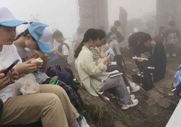 野外实习,面对的是基础知识积累和体力耐力的双重考验。每天清晨,整装待发的师生从小天池出发,跋山涉水、翻山越岭、餐风饮露,用脚步丈量着雄奇险秀的庐山。潮湿雾重,搭上泥泞的山路;烈日高悬,却遇漫长的石阶;风雨交加,伴随骤降的气温。而他们不惧风雨,不畏骄阳,不怕吃苦,通力合作,紧密地团结在一起,用坚定的意志战胜眼前的考验,征服了一个个高险耸立的山峰和深不可测的峡谷。勇敢前行的信念攻破了眼前的险阻,同学们即增长了见识,也培养出羁绊,彼此的情谊变得更加亲厚。跋涉的过程中同学们也感悟着人生的哲理:无论是科学探索,还是个人人生,船到中流浪更急,山到中途路更陡,然关关难过关关过,步步难行步步行,只要齐心协力,便能克险攻坚。