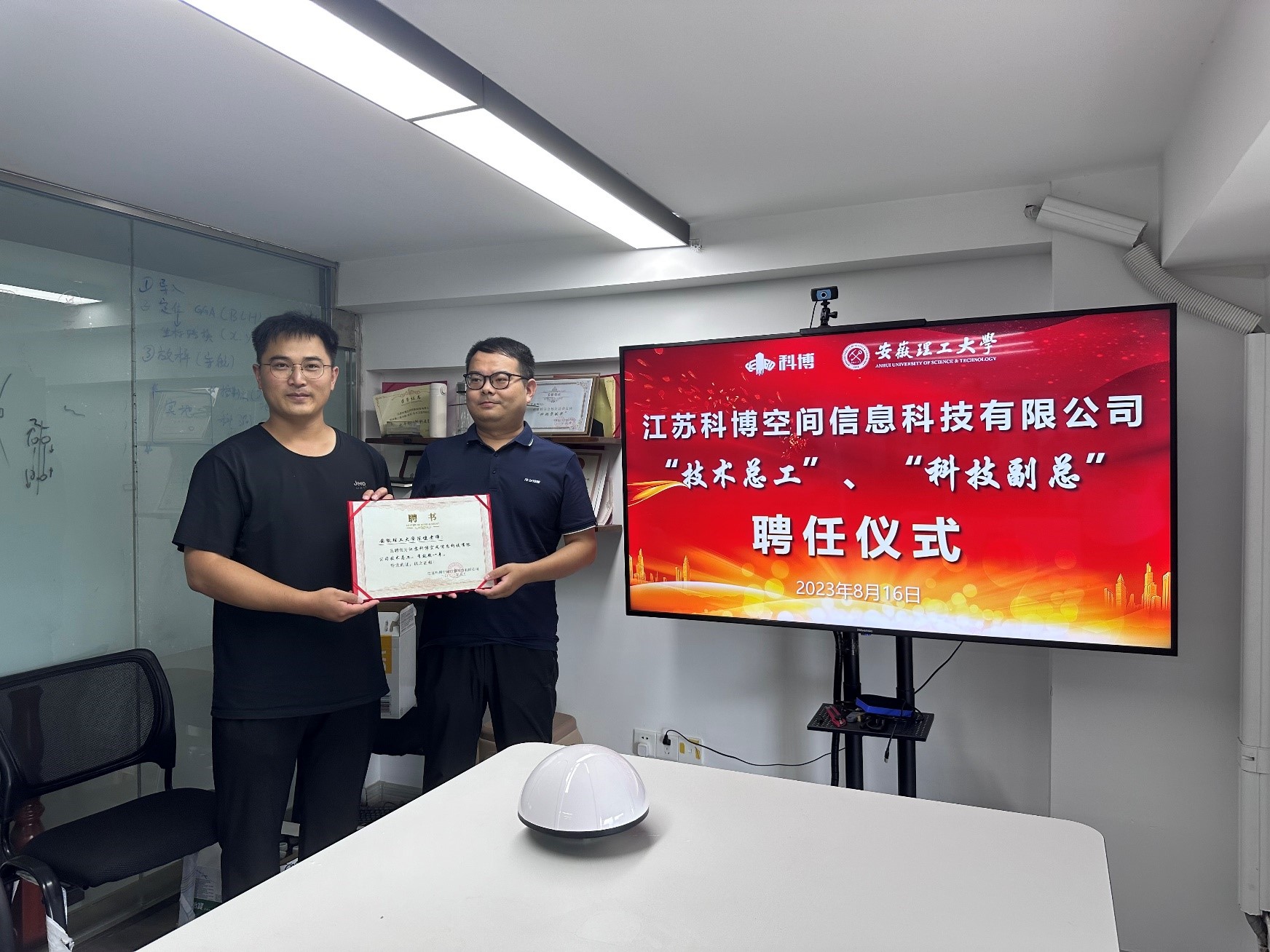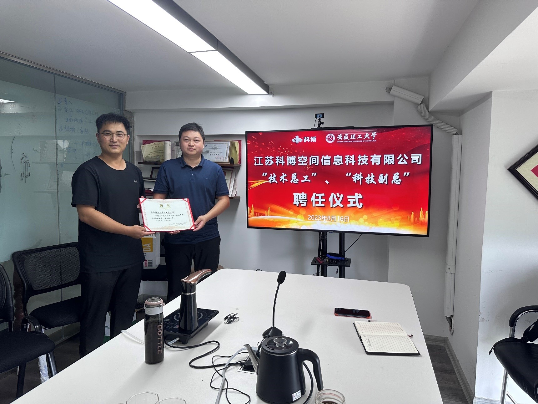 江苏科博空间信息科技有限公司技术部负责人王明明介绍了公司概括、北斗多源智能安全监测等业务,并就科技创新和岗位设置等进行了探讨。为了加强校企深度融合,促进科技协同创新,王明明为永利集团官网青年教师颁发了企业挂职聘书。