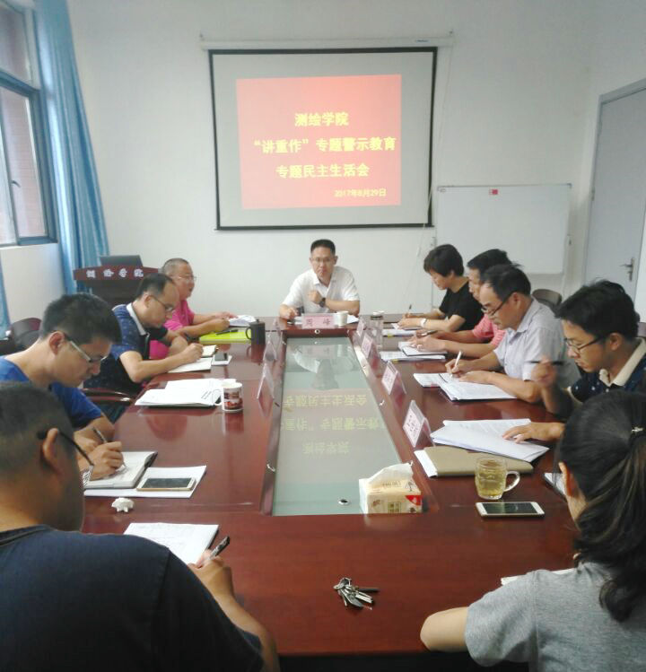 8月29日下午,测绘学院“讲政治、重规矩、作表率”专题警示教育专题民主生活会在测绘学院南511会议室召开。校纪委书记周峰到会指导,纪委办公室主任高仲姣陪同。学院全体党委委员参加了会议,学院各党支部书记列席会议。会议由学院党委书记吴军主持。