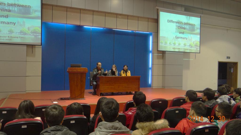 12月30日晚,测绘学院在北校区图书馆二楼报告厅成功举办了德国交换生与13级学生交流报告会。德国东威斯特法伦-利普应用科技大学三年级本科生Natasha Meuser与测绘学院大地测量与测量工程专业2012级硕士研究生黄璨同学(2012.8-2013.7德国奥斯纳布吕克应用科技大学留学生)与测绘学院13级的同学一起,进行了交流报告。报告会由测绘学院教学科研副院长徐良骥主持,13级辅导员袁彦老师参加了报告会。