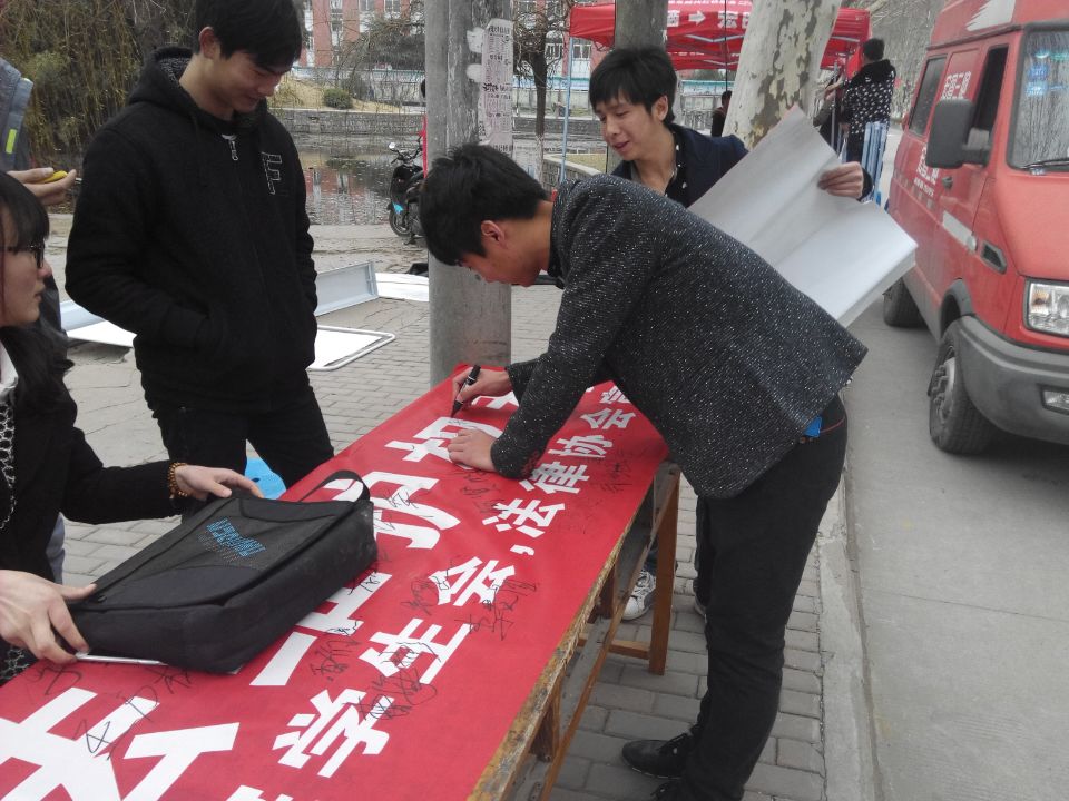 上午八点,来自测绘学院与法律协会的志愿者们便在北校区爱情湖畔设立了宣传点。志愿者们向来往的同学分发法律宣传单,向他们耐心的讲解一些消费者权益的相关知识,传播法制观念,并号召同学们运用法律武器积极维护大学生的合法权益,同学们也对志愿者的行为表示赞赏与感谢。随后,志愿者们邀请同学参与横幅签名,大家通过横幅签名,表达自己对法制社会、合理消费等知识的理解以及积极传播法律思想、用法律维权的决心!部分同学还在小纸条上写下自己对法律的一些感悟和对法治社会美好明天的憧憬。此外,一些对法律及人文社会科学比较了解的同学则在现场和志愿者们就法律的一些相关问题进行了讨论,通过分析和采纳对方的思想,也让自己对法律的理解更加的深刻。宣传活动一直持续到下午,取得了十分积极的效果。参与活动的同学和志愿者们均表示,对依法维权等又有了新的认识,收获很大。