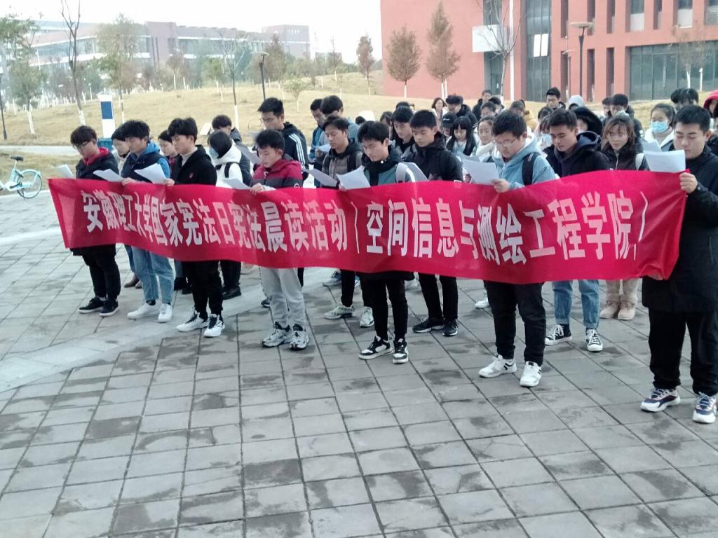 清晨,太阳还未升起,同学们就已经来到了学院楼前。40余名学生代表在庄严肃穆的氛围中,在领读人的带领下集体诵读宪法部分章节,并重点学习宪法总纲、公民的基本权利和义务,通过激昂有力的声音传达自己对宪法的尊崇。“中华人民共和国公民在法律面前一律平等;国家尊重和保障人权;任何公民享有宪法和法律规定的权利,同时必须履行宪法和法律规定的义务”……。