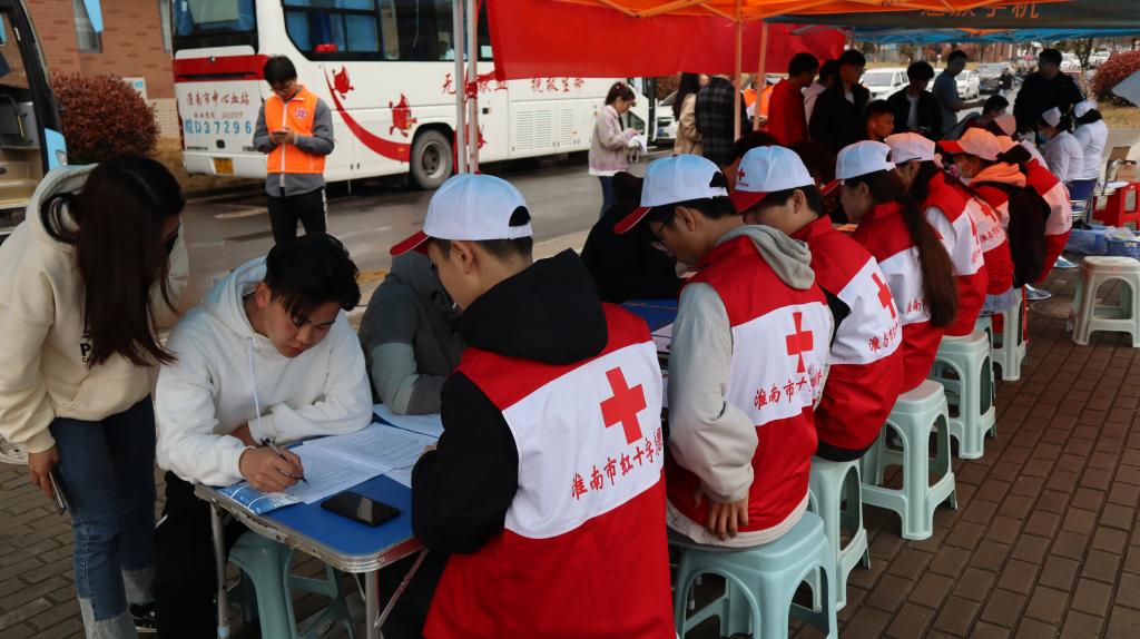 献血活动由淮南市血站派遣献血车,采血过程均由专业医护人员操作。献血车外,志愿者们细心地为各位同学讲解献血的注意事项,对报名参加献血的志愿者进行谨慎的筛查,保证所有献血者满足必要的条件,能够健康安全地参加献血。符合条件的献血者在进行血压测量以及血型检测之后方可进入献血车献血。在车内,医护人员再次询问健康状况并进行登记、检测。志愿者们也为参与献血的同学积极提供糖水、零食等为献血活动保驾护航。经过工作人员对造血干细胞采集取样详细的介绍,不少同学在献血后,自愿同意采集造血干细胞样本,加入中华骨髓库,成为一名光荣的造血干细胞采集取样志愿者。
